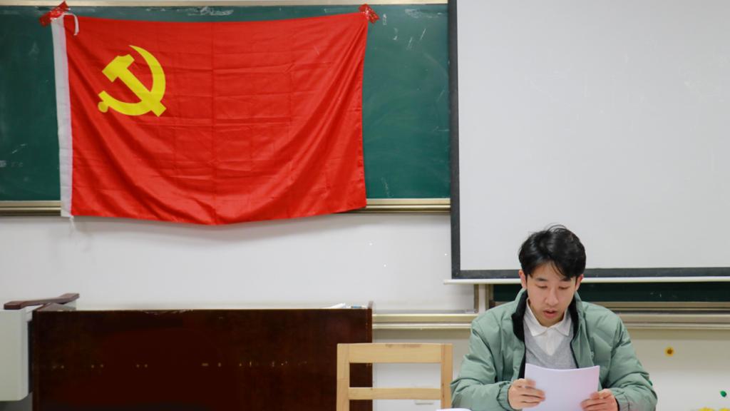 图为第一党支部书记袁铭泽在宣读决议