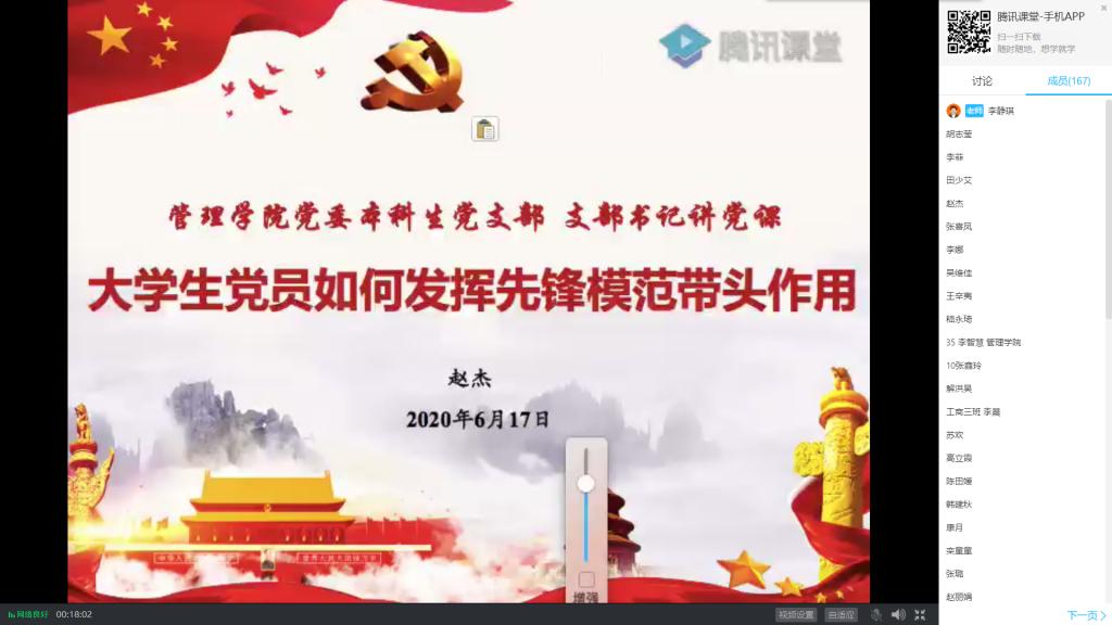 6月17日,斗地主 党委本科生党支部依托腾讯课堂,召开主题为《大学生党员如何发挥先锋模范带头作用》的党课会议,支部书记赵杰担任主讲,支部全体成员及入党积极分子参加会议。