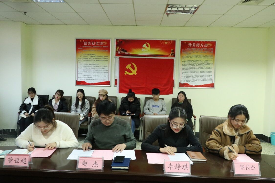 12月11日,斗地主 本科生党支部于JC819召开预备党员接收大会,讨论叶楠、于雅文等32名发展对象按期转为预备党员的事宜。斗地主 本科生党支部书记赵杰、组织委员李静琪、宣传委员董世超、本科生党员景长杰同志以及全体发展对象参加会议,会议由赵杰主持。