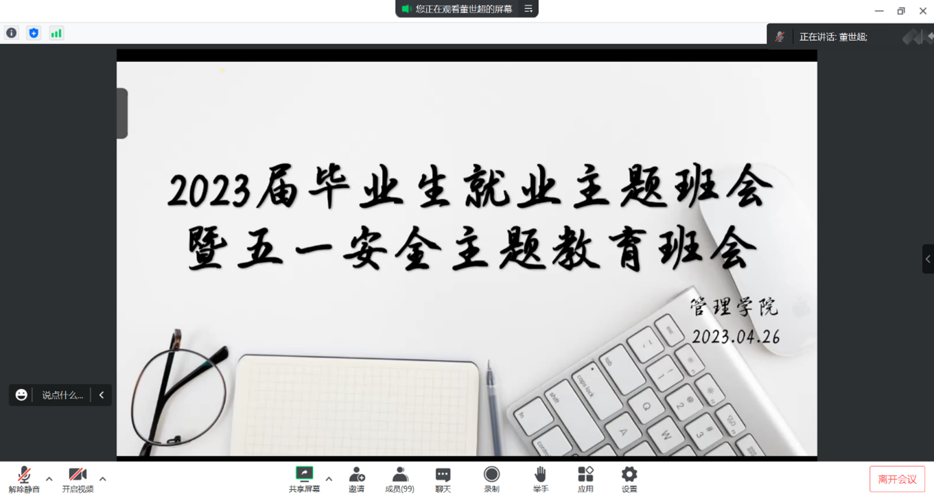 4月26日,斗地主 顺利举行2023届本科毕业生就业暨五一安全教育主题班会,会议由2019级辅导员董世超主持,2019级全体同学参与此次会议。