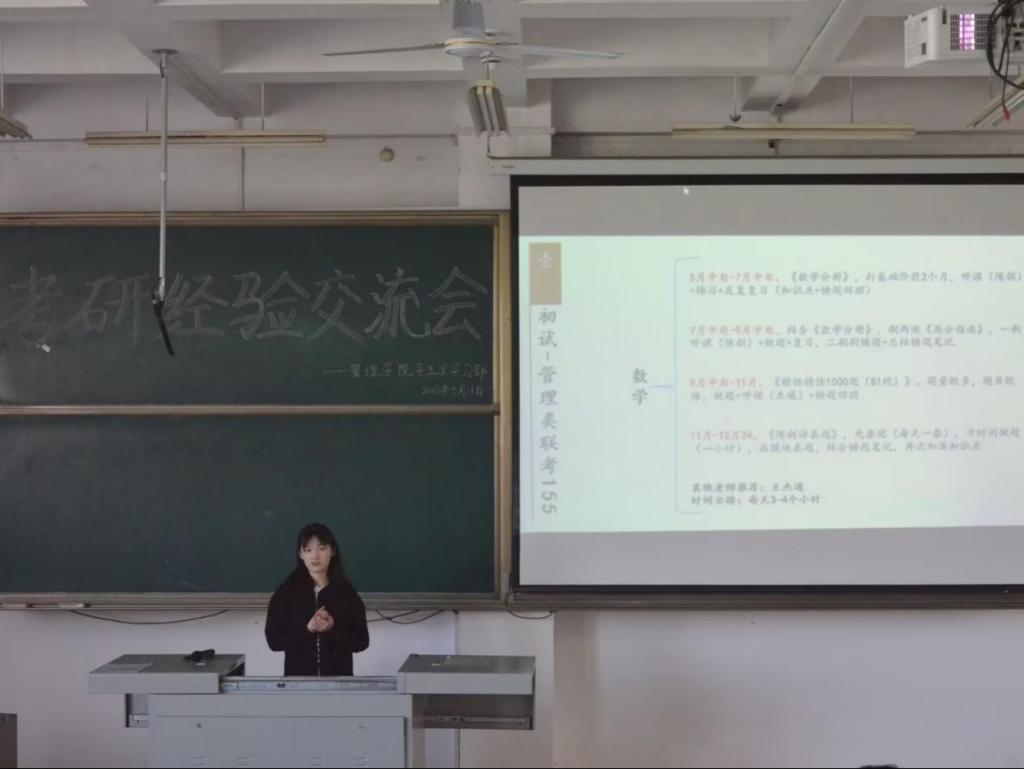 此次经验交流会分为两部分内容,首先分别来由自工商管理、管理科学与工程、会计专硕等六个不同专业的往届毕业生现场进行经验分享。此环节中,他们用心制作了精美的PPT,从自身的考研经历出发,围绕如何选取专业和院校、制定合理的学习计划、调整备考心态、宝藏学习资料以及复试中的注意事项等方面展开叙述,并且畅谈了自己的考研以来的心路历程和经验积累。其次是提问环节,经过上一环节的经验分享,在场管院学子增强了对于自我考研的新认识和定位,六位成功上岸的优秀学子留下自己的联系方式,希望能够帮助考研学子答疑解惑。本次活动全程氛围轻松活跃,观众认真倾听,反响热烈。