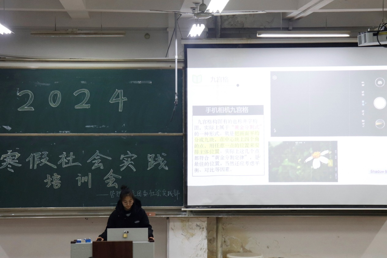 会议伊始,社会实践部就社会实践流程以及实践报告的撰写进行讲解,详细介绍介绍了如何选择实践项目、制定实践计划、进行实践总结等一系列内容;随后,宣传部对社会实践稿件的撰写展开培训,针对稿件撰写中易出现的问题进行说明和指导,从摄影方面进行培训,就手机和相机的使用技巧及注意事项进行详细讲解,同时讲解了摄影的基本原理和技巧;最后,2023年暑假社会实践先进个人温思诺结合自身经历,从成果宣传以及在中青校园上传稿件时的注意事项等方面进行经验分享,向在场的学生传递了实践的乐趣,激发了管理学子参与社会实践的热情。