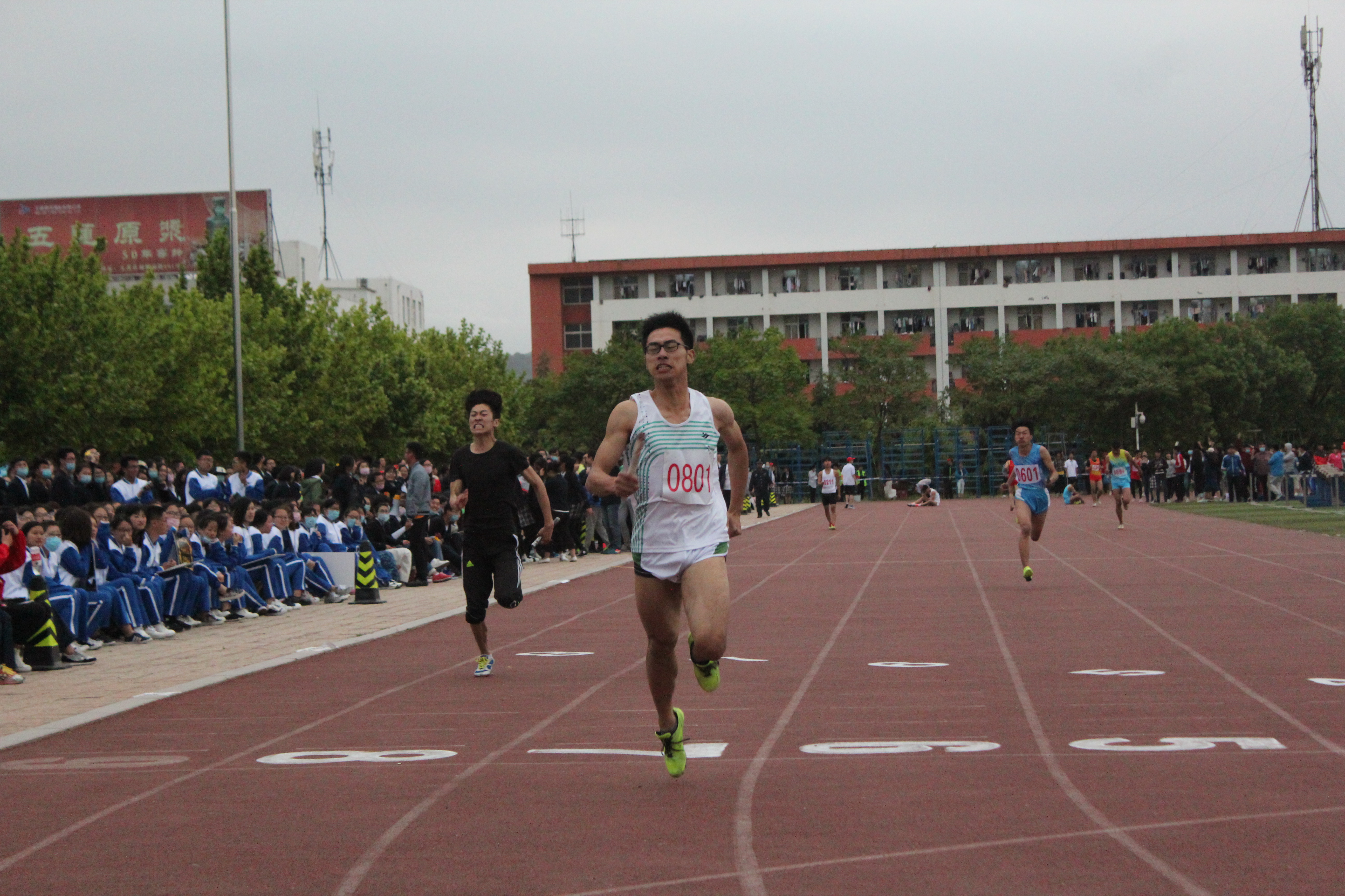随着发令枪响,万众瞩目的100米决赛正式开始了,我院运动员陈鼎不负众望,再次创造佳绩,取得男子组100米决赛第二名的好成绩。女将袁媛也不甘示弱,奋起直追,在女子组100米决赛中表现突出,取得第二名的优异成绩。我院运动员不仅在单人赛中表现突出,在团体赛中更是凭借密切合作,屡创佳绩。在压轴进行的4×100接力的决赛中,我院运动员们势如破竹,勇往直前,女将袁媛更是上演了连续反超两人的精彩表现,最终男子组与女子组都取得了不错的成绩。不仅如此,我院在趣味运动项目中也有不俗表现,在三级跳和铅球比赛中,韩树生和李丽雯分别取得了骄人的成绩。全场观众,一片沸腾,处处充满欢呼的掌声。随着比赛结束哨声的响起,今天的赛程圆满结束。