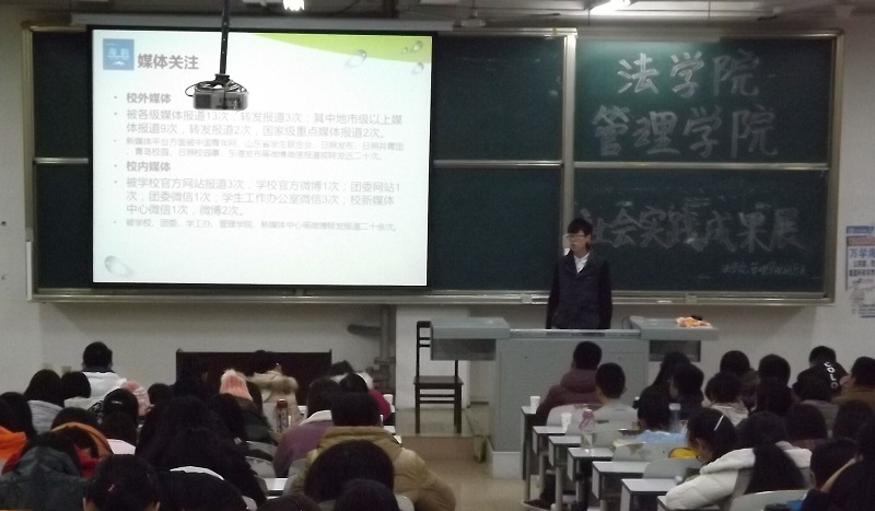活动伊始,精彩的视频展示了社会实践的精彩瞬间。我院海韵“四个全面”观察团主讲人朱灏向大家展示了日照东港区开发情况。他详细地介绍了其实践的过程以及调研过程中发现的问题和针对这些问题提出的方法和建议,并指导同学们如何完成实践报告。我院“康启实践团”的主讲人袁晟睿以“山东寿光蔬菜供应链现状研究”为课题进行了社会实践成果展示。他强调以专长服务社会,并结合自身经历为大家悉心讲解。法斗地主