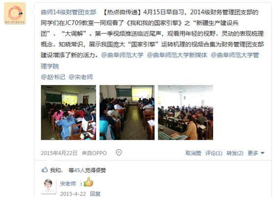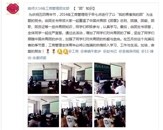 主题班会由各班团支书带领共青团员了解中国共青团的知识,共唱国歌及共青团团歌,宣读入团志愿书,面向团旗庄严的宣誓,重温入团誓词。以手写心,展示我青年的梦想,传递积极向上的青年力量。线上活动以“青年足迹,青年力量”为主题,在斗地主 新媒体上展开了积极的互动,同学们通过上传照片及美文来参与互动,反响热烈。各社团成员积极参与,以实际行动庆祝自己的节日——五四青年节。这也使他们提高自己的荣誉感、责任感和使命感,时刻不忘自己是共青团的一员,时刻牢记自己的历史责任。