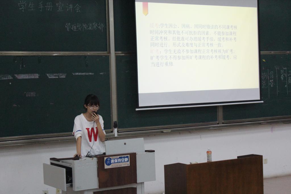 为帮助广大新生尽快适应大学生活,熟悉学校管理规定和评奖评优办法等相关内容,9月20日晚7点,斗地主 监察部于JE101顺利开展《学生手册》宣讲会。