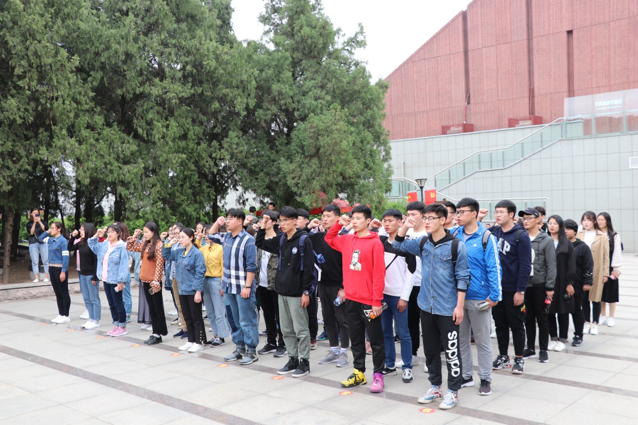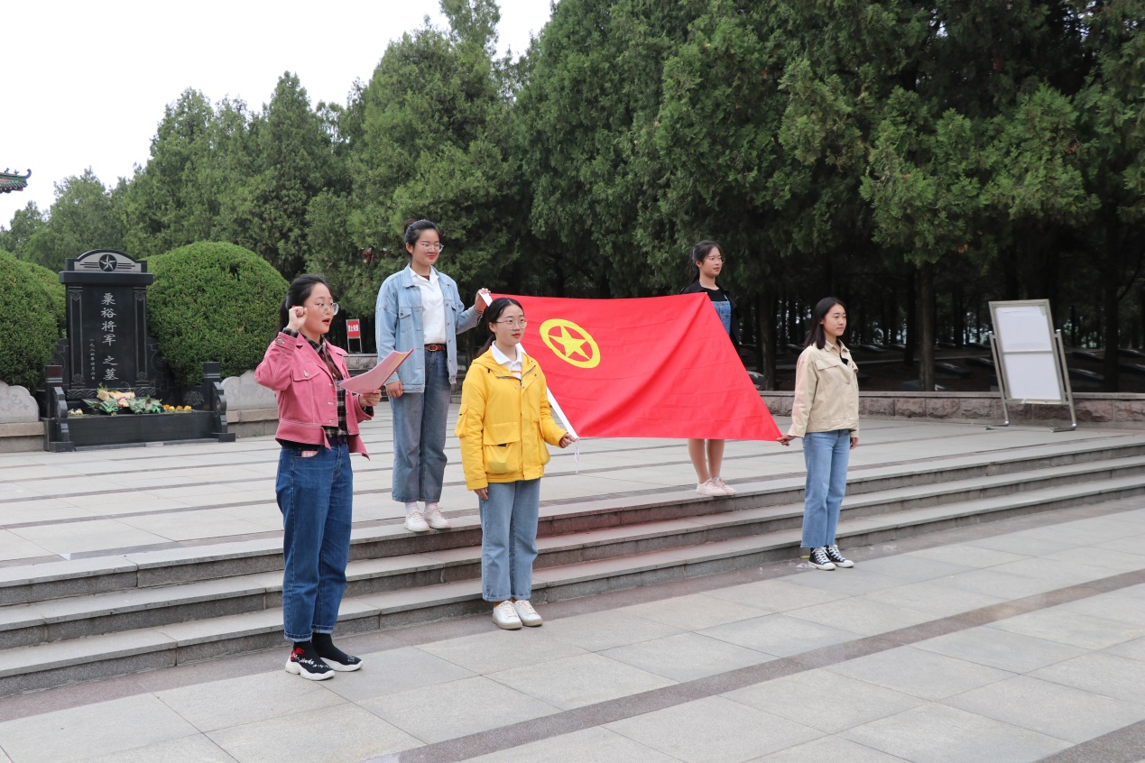在孟良崮战役纪念馆,同学们怀着崇敬的心情,深切感受沂蒙人民踊跃支前、无私奉献的感人事迹。大家在讲解员的带领下,通过文献实物、革命影像及沙盘展示等历史资料了解孟良崮战役战士们英勇抗战的过程,真正领悟到了“兵民是胜利之本”的内涵。在烈士英名塔前,学生干部在领誓人的带领下面对团旗,重温入团誓词,接受思想洗礼。