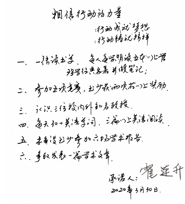 承诺书涵盖了本学期的个人发展规划及要求,期望同学们保质保量完成新学期学习任务的同时,利用课余时间学习写作论文、参加科研训练项目及学科竞赛,并积极与老师进行交流探讨学习与发展。