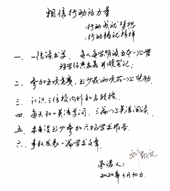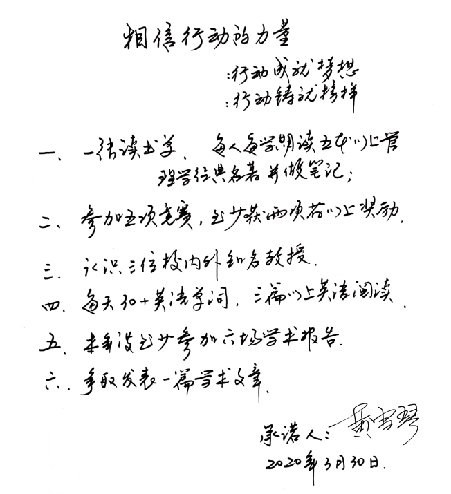 行动决定高度,目标决定前途,本次特班同学学习承诺书签订活动为特班同学制定了新的目标,同时也为其新学期的学习与发展奠定良好基础。