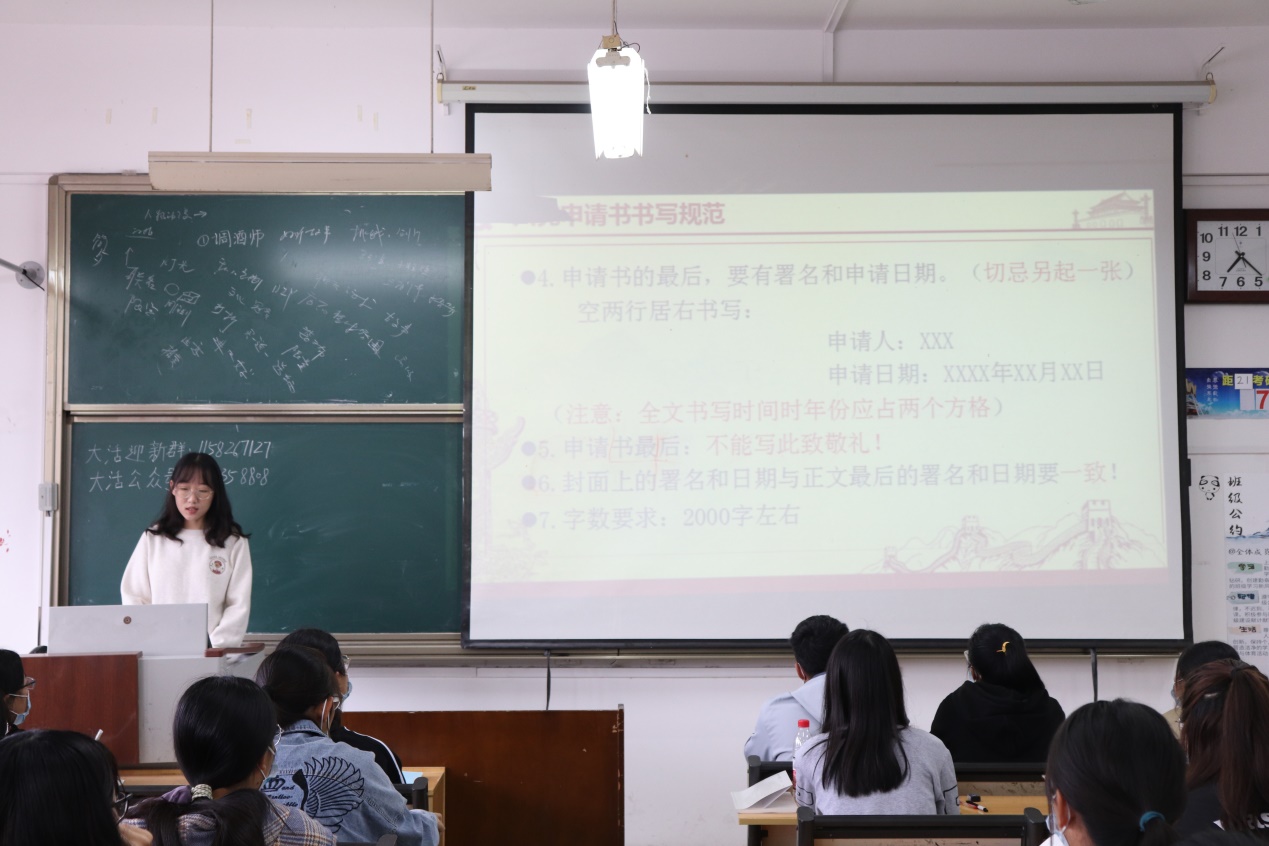 此次入党思想启蒙宣讲分为四个部分——党的简介、入党原则、入党流程概况、入党申请书书写规范。宣讲人首先向同学们介绍中国共产党的发展历程、性质、宗旨、最终目的等内容,接着解读入党原则和入党流程,详细说明了入党积极分子和发展对象的评选标准。最后,宣讲人员通过PPT图片和板书演示直观清晰地展示入党申请书的书写规范,帮助同学们规避常见的问题。
