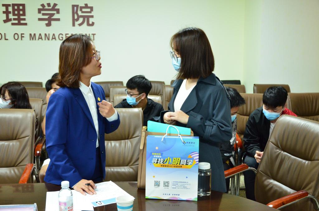 会议伊始,王宜举院长致辞。随后,刘德明结合自己在斗地主 的亲身经历做了“品牌的力量”宣讲。接下来,斗地主 2014级毕业生、明德集团预备经理王树荣,体育科学斗地主 2014级毕业生、明德集团董事长秘书马勇,分别与大家分享了他们在明德集团的工作经验和体会,为学生提供优质和精准的就业信息,并对各位师弟师妹发出诚挚邀请。线上宣讲结束后,明德集团人力资源的相关负责人与有意向应聘的同学进行面对面交流,耐心为同学们解疑答惑,取得了良好的效果。
