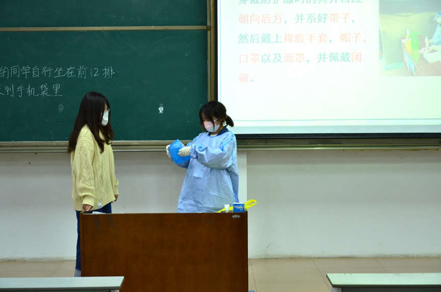 培训会第一阶段,袁铭泽首先从志愿汇APP使用注意事项切入,着重强调了个人信息完善的重要性。随后,他对志愿活动所需要的防护用品、北门登记快递信息两方面内容做出详细介绍,并邀请青年志愿者协会干事任佳向大家现场展示防护服、口罩、面罩、橡胶手套等防护物品的正确穿戴方法。