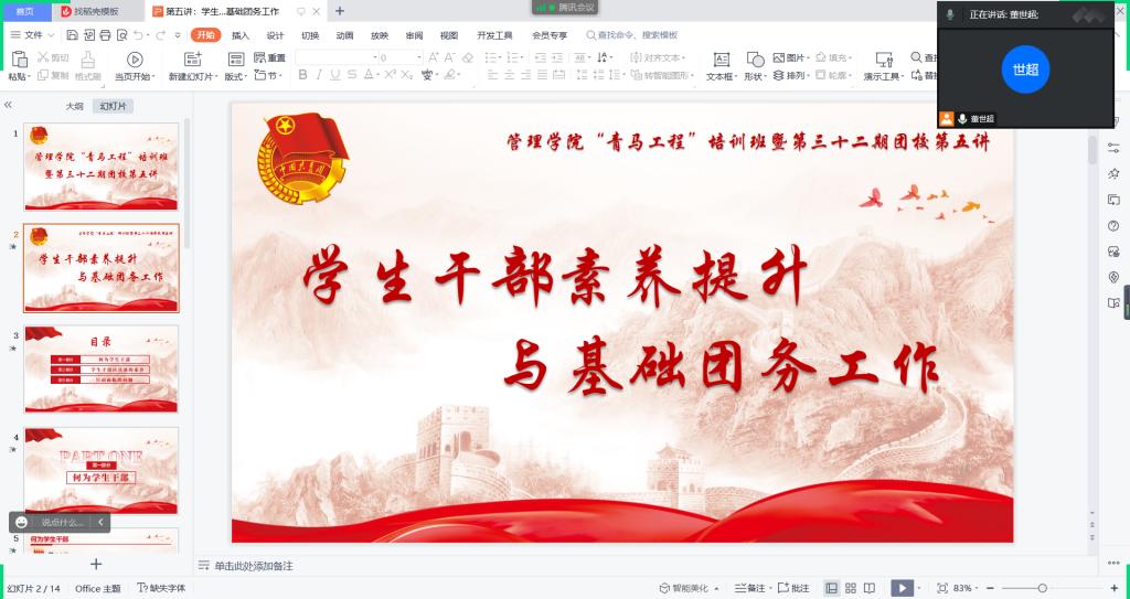 (通讯员:刘元枫)为认真贯彻落实党的二十大精神,进一步提高学生干部的素质,增强基层团学组织的创新能力、实践能力和组织协调能力,12月11日,斗地主 采用线上形式顺利举办“青马工程”培训班暨第三十二期团校第五讲,本次培训的主题是“学生干部素养提升与基础团务工作”,培训会由团委书记董世超主讲,青马工程培训班全体成员参与。