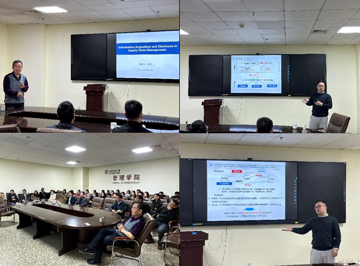 关旭教授首先结合实际案例介绍了不对称信息下供应链管的现实背景。然后,关教授介绍了他在这一领域内的主要研究方向以及取得的重要研究进展。一方面,关教授分享了市场信息获取和产品质量披露下供应链管理策略的研究成果。围绕这一方向,关教授从供应链结构、模型分析以及主要结论进行详细介绍。另一方面,关教授分享了渠道结构和信息不对称下供应链管理策略的研究成果。围绕这一方向,关教授分别从上游供应商和下游零售商的角度介绍为何研究产品质量披露动机和需求信息分享动机的科学问题。关教授进一步介绍了如何分析供应商入侵给传统供应链管理策略带来的影响,并分享了他在这一方向得出一些与众不同的研究成果,如,直销渠道的建立会提高供应链中的信息透明度,使零售商受益,并且损害供应商,从而导致供应商放弃入侵零售市场。此外,关教授还分享了上述研究成果在管理学领域顶级期刊Production and Operations Management 发表多篇学术论文的经验。最后,关教授耐心细致地回答了老师、同学提出的问题,并就大家感兴趣的问题与老师和同学们进行了深入的交流,让大家受益匪浅。
