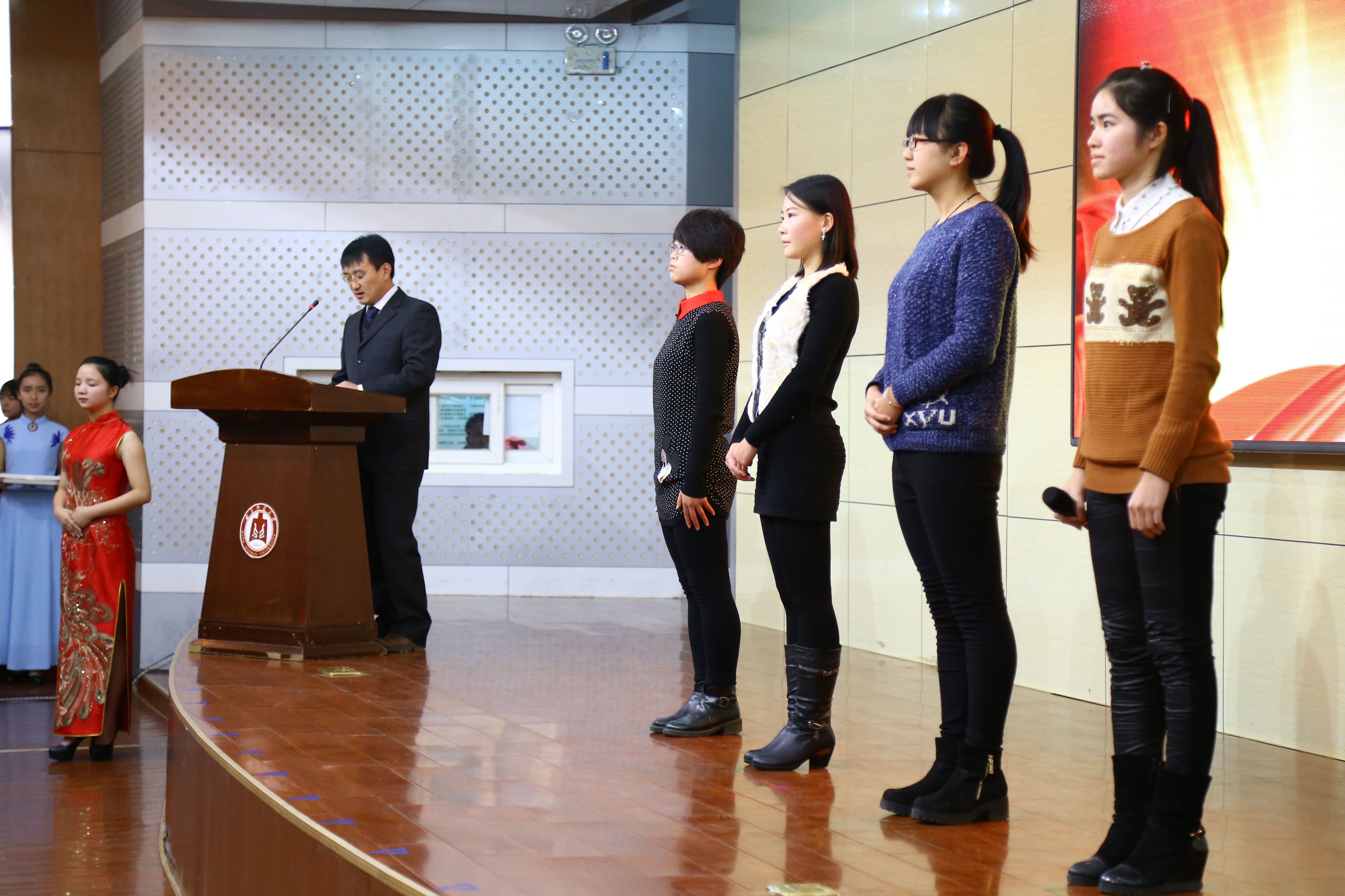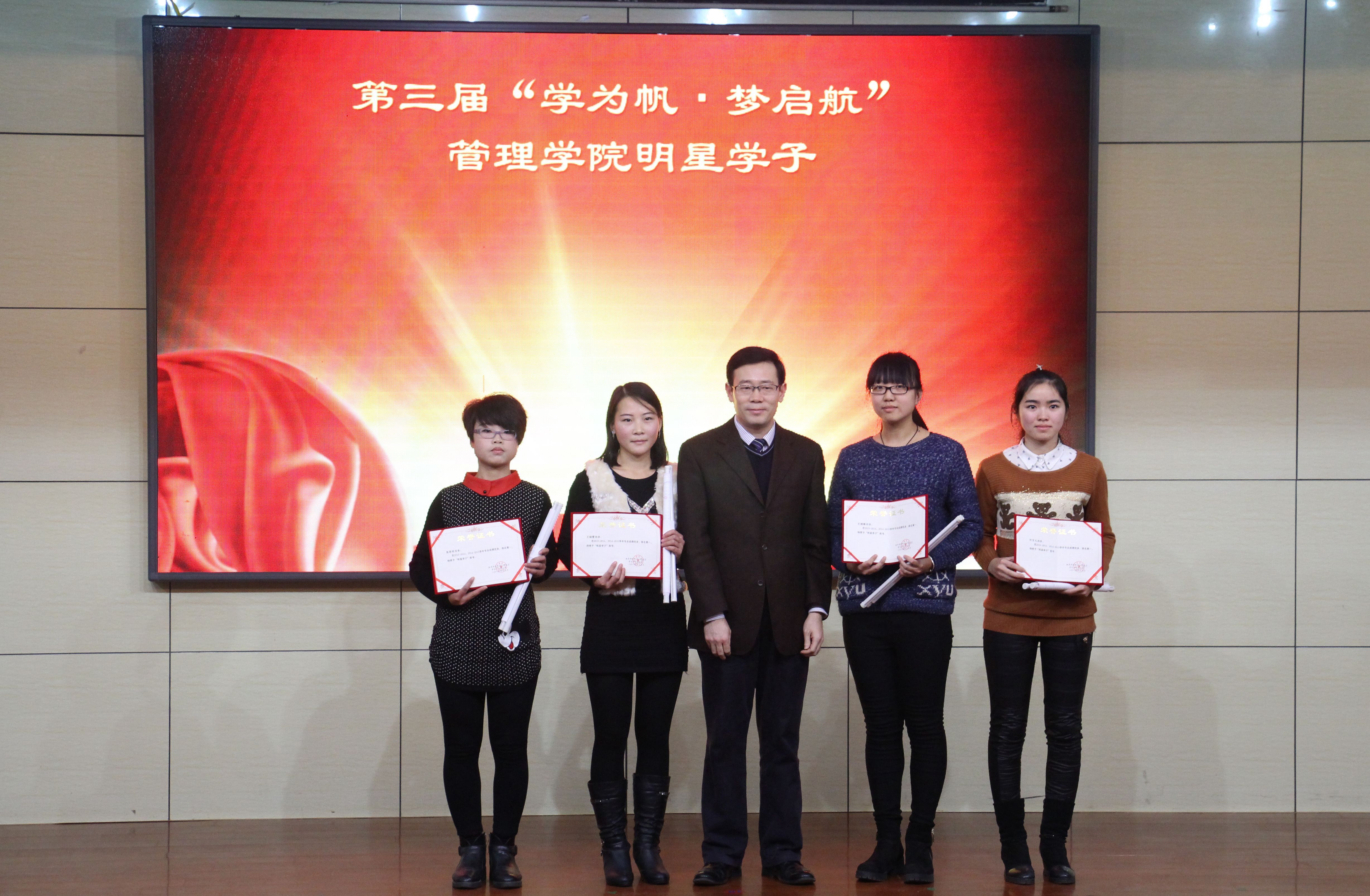 浏览量: 更新日期:2015-12-1012月8日,第三届“学为帆•梦启航”学风教育活动启动。我院4名专业成绩第一的同学——石晓琳、叶宇凡、张思明、王晓慧,受到表彰,校长戚万学亲切会见受表彰同学并与他们合影留念,勉励同学们刻苦读书、亲近经典,“使读书成为一种习惯和生活方式,让校园里涌现出更多的学霸、学神”。