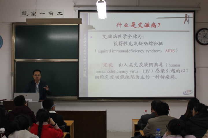 讲座伊始,李大夫介绍了第一夫人彭丽媛和体育健儿傅园慧的抗艾宣传,表明国家对抗击艾滋病的重视程度,进而开始介绍艾滋病的相关名词、染病起因及发病过程等基础知识,解读艾滋病的传播途径与预防方法。过程中,李大夫借助相关现实案例从国家到省份到个人多方位的论证了艾滋病蔓延速度之快,将理论知识阐述的通俗易懂。互动式的交流更加深了同学们对艾滋病知识的了解。最后,郑科长作了总结性发言并发出倡议:健康生活,热爱生命。