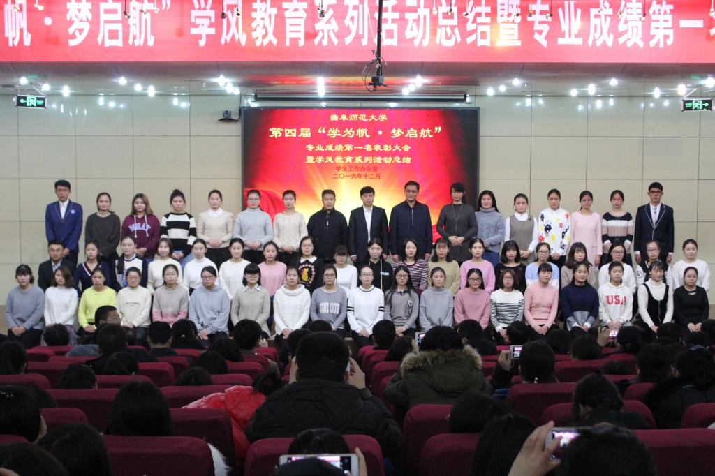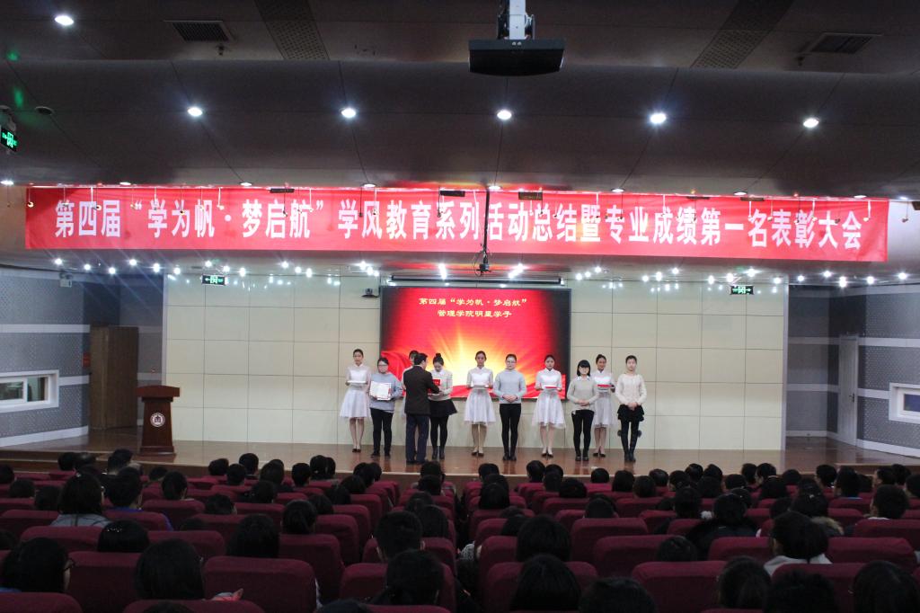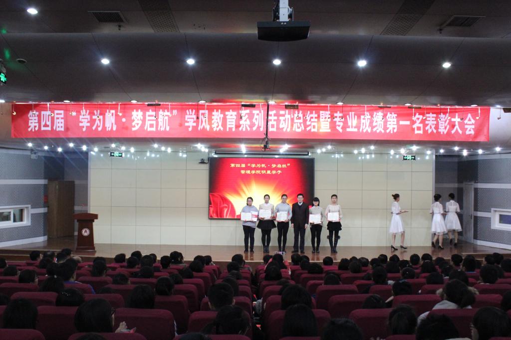12月14日,学校隆重举行第四届“学为帆,梦起航”学风教育系列活动总结暨专业成绩第一名表彰大会。学校校长张洪海、副校长扈庆学、副校长夏云杰出席了表彰大会。张洪海校长代表学校在表彰大会上讲话。我院2014级五个专业排名第一的五名同学受到隆重表彰,她们分别是财务管理专业孙丹同学、信息管理与信息系统专业吕文蓉同学、工商管理专业徐俊妮同学、物流管理专业王玉杰同学、市场营销专业史宝珍同学。