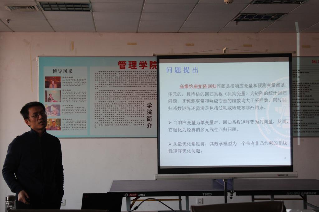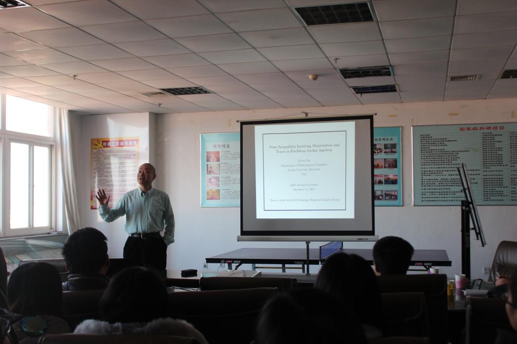 应斗地主 邀请,美国马里兰洛约拉大学(Loyola University Maryland)的Jiyuan Tao教授与北京交通大学的孔令臣教授于2016年12月15日-18日来斗地主 进行学术访问,期间与斗地主 相关老师和研究生进行了学术交流与研讨,并做了学术报告。12月16日,两位专家分别做了题为《Some Inequalities Involving Majorization and Traces in Euclidean Jordan Algebras》与《高维约束矩阵回归问题探讨》的学术报告。Tao教授在报告中介绍了Euclidean Jordan algebras中的不等式:Thompson Majorization Inequality ;Araki-lieb Thirring Inequality; Golden-Thompson Inequality。孔教授介绍了高维约束矩阵回归问题,并对高维约束矩阵回归的优化理论与算法研究现状进行总结,提出相应的研究问题和可行的途径。12月17日,两位专家又分别做了《Mathematical Statistics》与《Measuring and testing dependence by correlation of distances》的学术讨论讲座。参加报告与学术讲座的有我院从事优化与管理的老师及研究生,我院屈彪老师主持了报告会和讲座。