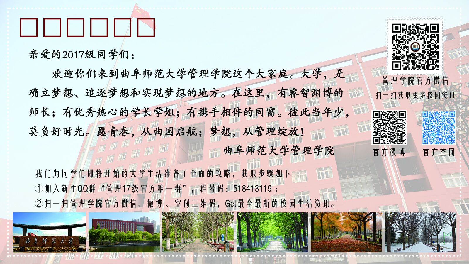 为所有新生准备了精美的明信片,鼓舞新生莫负韶华,奋勇向前。