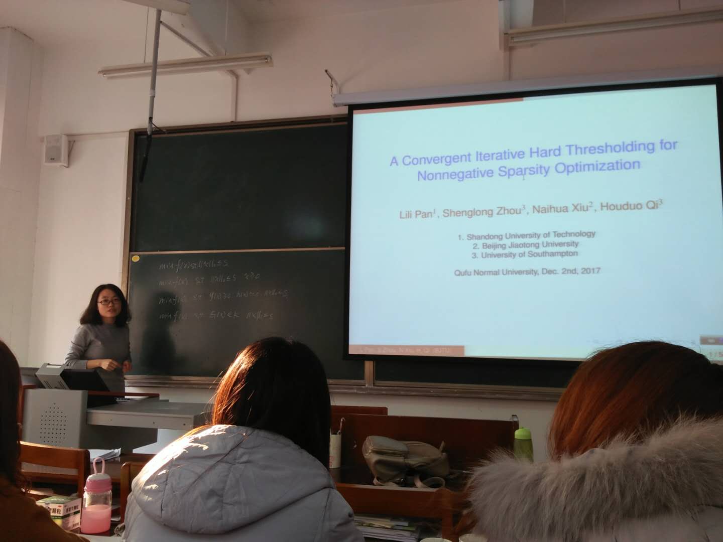 浏览量: 更新日期:2017-12-0412月2日和3日,应斗地主 邀请,山东理工大学数学与统计斗地主 潘丽丽博士老师来我院进行学术交流和访问,期间做了题为《A Convergent Iterative Hard Thresholding for Nonnegative Sparsity Optimization》和《稀疏优化问题的新进展》的学术报告。报告会由屈彪教授主持,斗地主 相关教师和研究生参加。