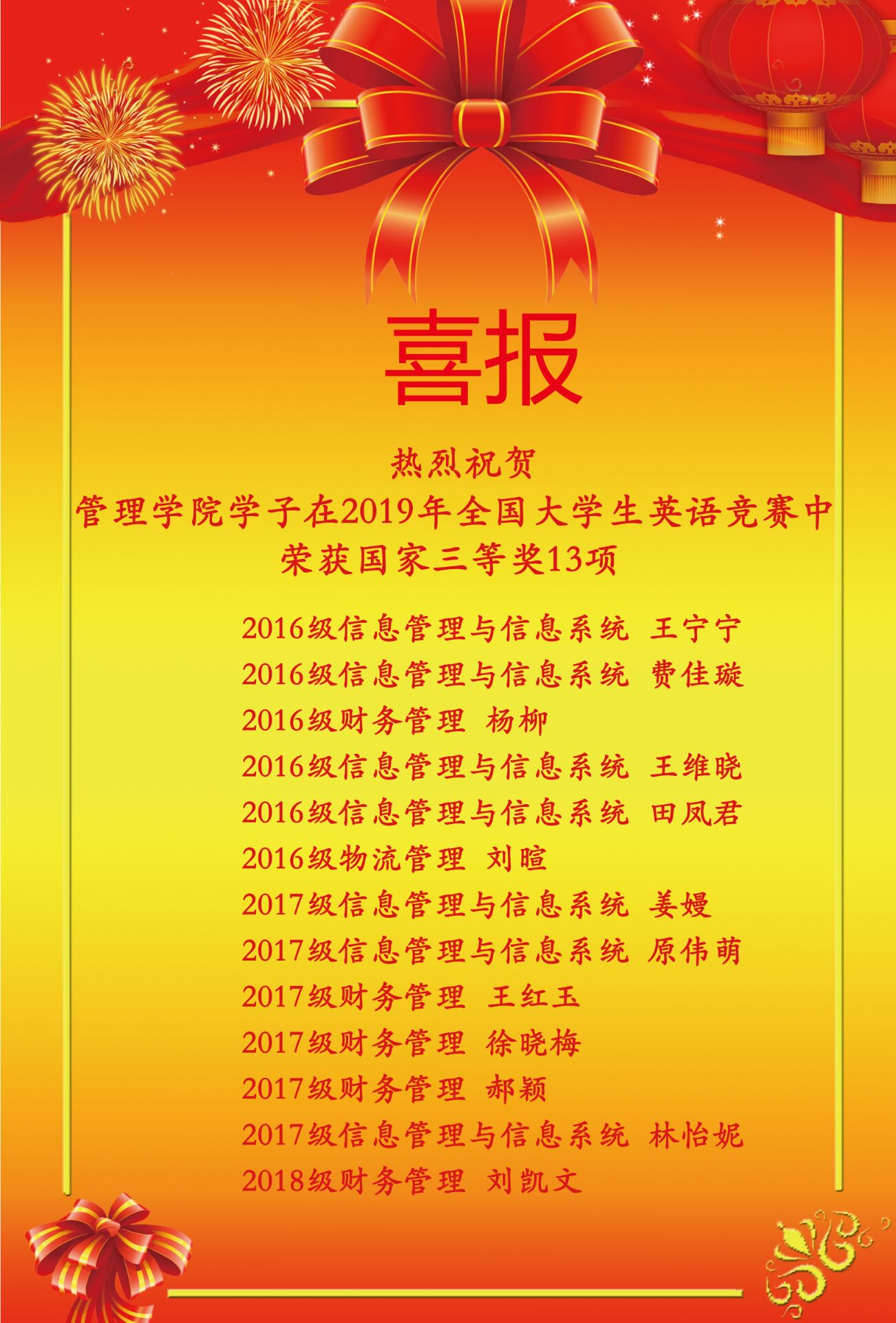 浏览量: 更新日期:2019-06-03日前,教育部2019年全国大学生英语竞赛决赛成绩揭晓,我院学生表现优异,获得全国特等奖1项,全国二等奖11项,全国三等奖13项的好成绩,获奖数量日照校区排名第一。其中,斗地主 2016级财务管理专业刘琳是全校唯一一个荣获C类(非英语专业)特等奖的学生。