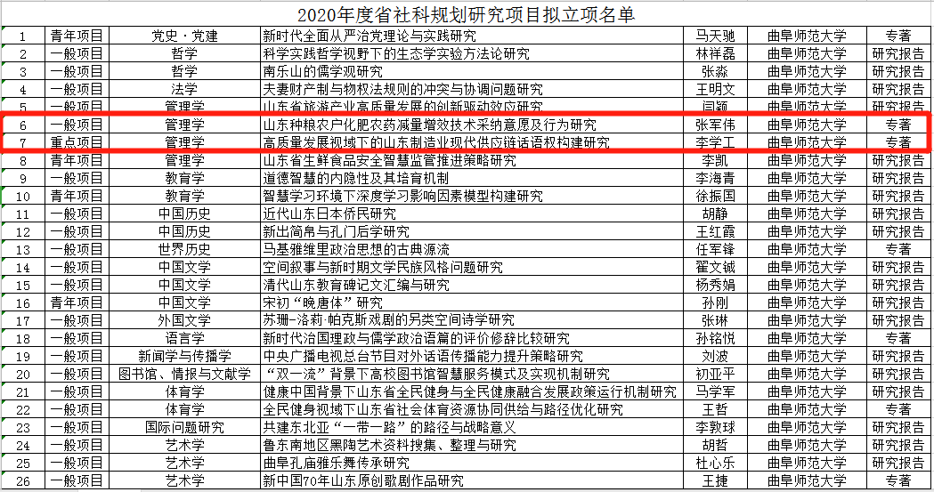 浏览量: 更新日期:2020-03-07日前,山东省社会科学规划管理办公室公布了《2020年度山东省社会科学规划研究项目拟立项名单》,此次斗地主 共获批26项,斗地主 获批2项。其中,李学工教授的“高质量发展视域下的山东制造业现代供应链话语权构建研究”课题获批山东省社科规划研究重点项目,为此次获批的全校唯一一项重点项目;张军伟博士的“山东种粮农户化肥农药减量增效技术采纳意愿及行为研究”获批山东省社科规划研究一般项目。